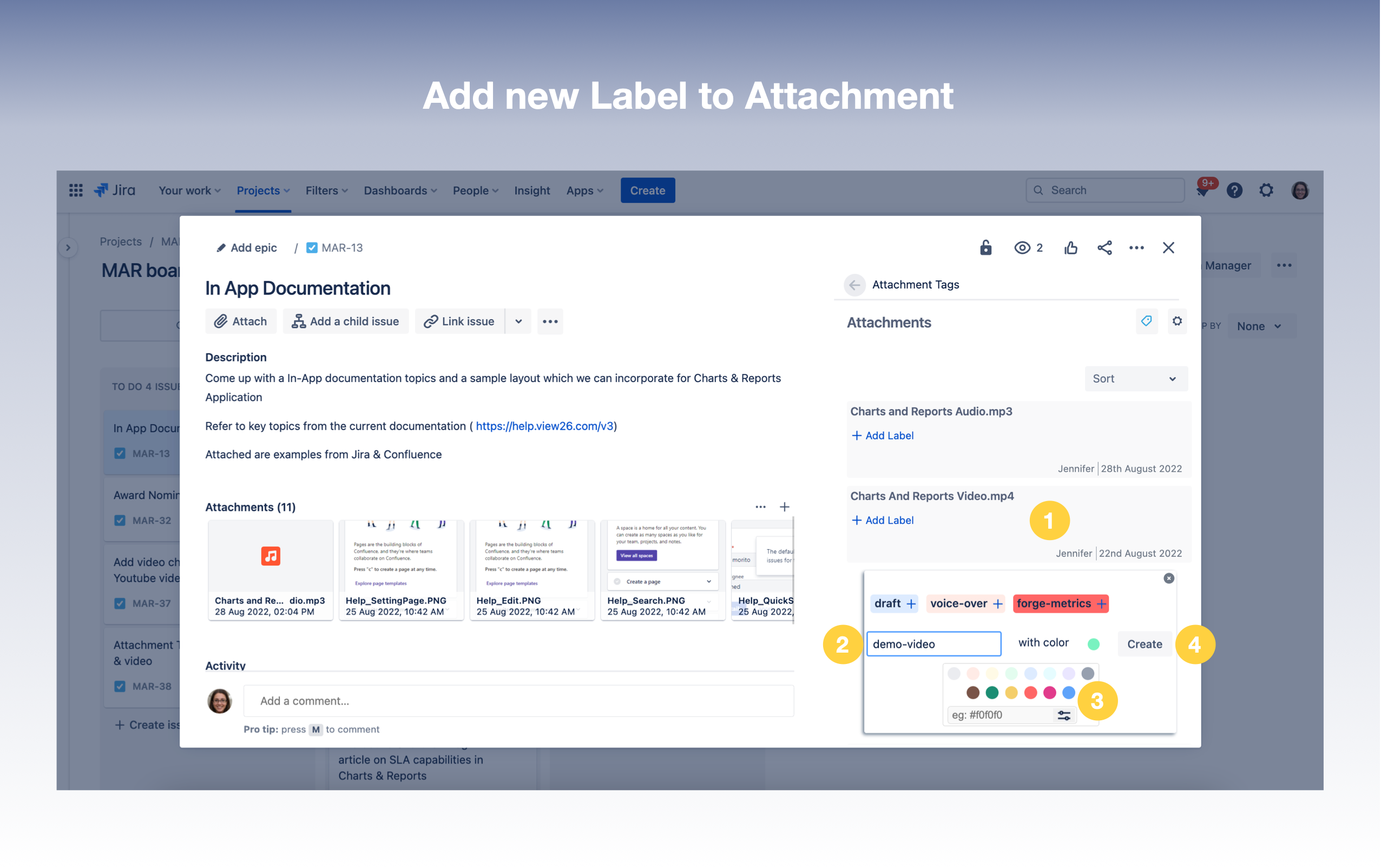 Click on + Add Label or anywhere on the grey box for the attachment (Here in this example we create a label for the attachment Charts And Reports Video.mp4)