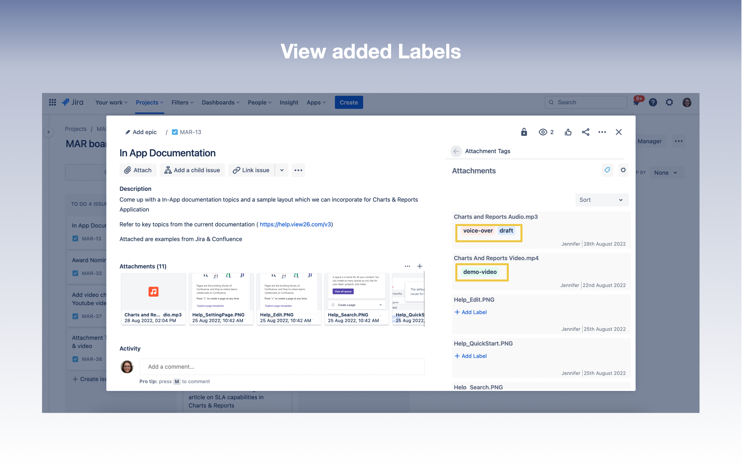 In the example below, the labels voice-over and draft have been added to the attachment Charts And Reports Audio.mp3. And the label demo-video has been added to the attachment Charts And Reports Video.mp4