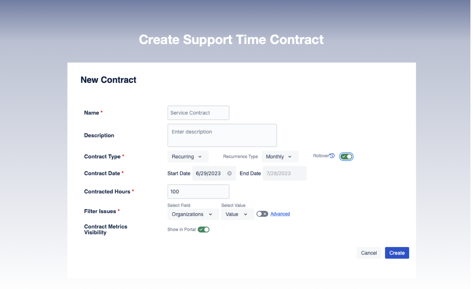 Recurring Contract - Once the Recurring Contract (smart contract ) feature is activated, the system takes charge of automatically generating a new contract for you every month or year, based on the contracted hours of your existing contract. Additionally, any unused hours from the previous contract will seamlessly carry over to the new one if you enabled the rollover button