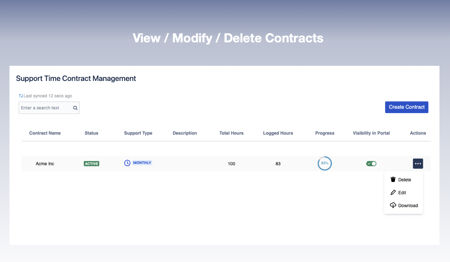 Once a Contract is created, it appears on the Support Time Contract Management Dashboard