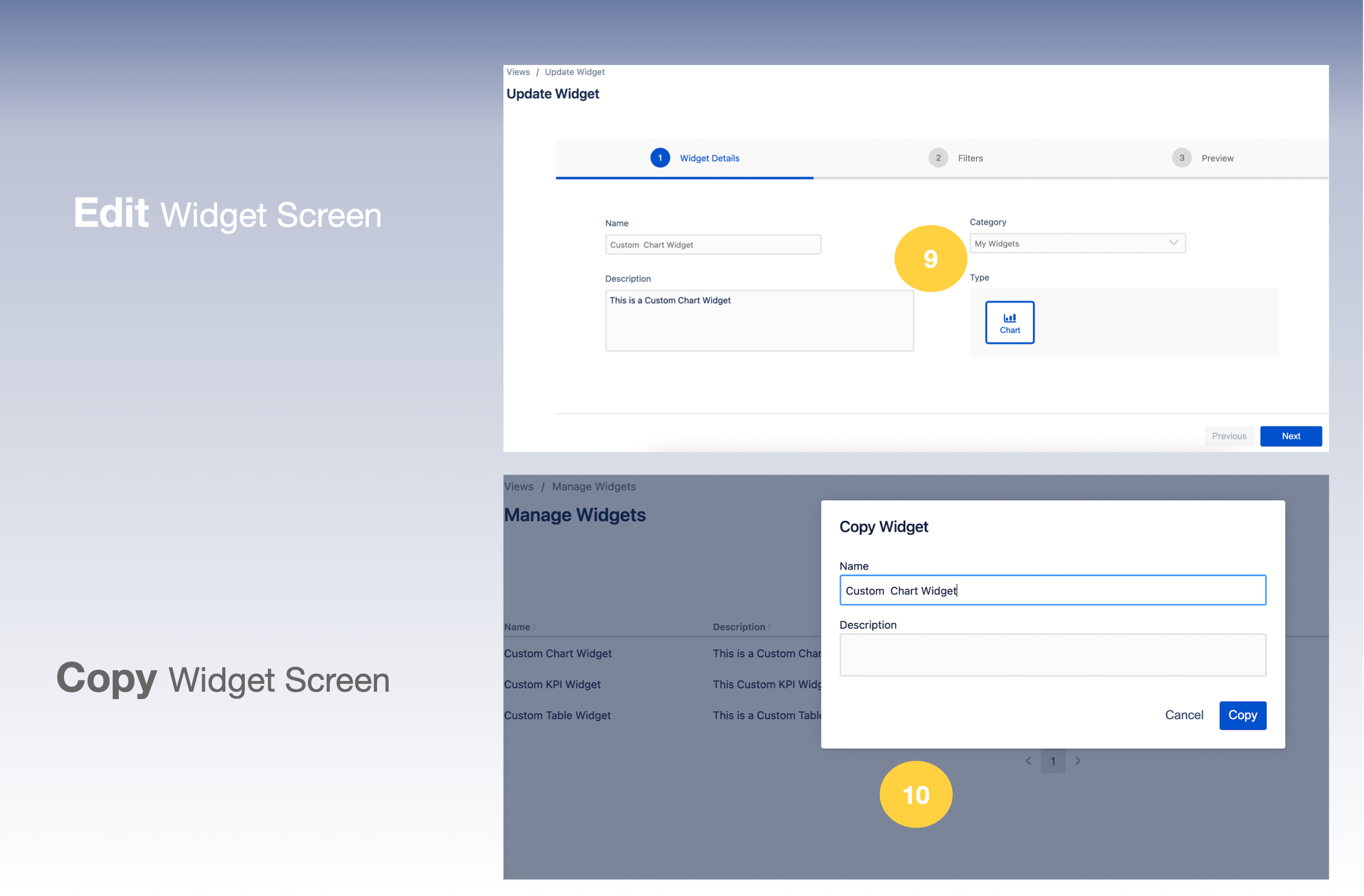 10. On click of Copy - The Copy Widget window would appear where you can enter the Name of the new widget