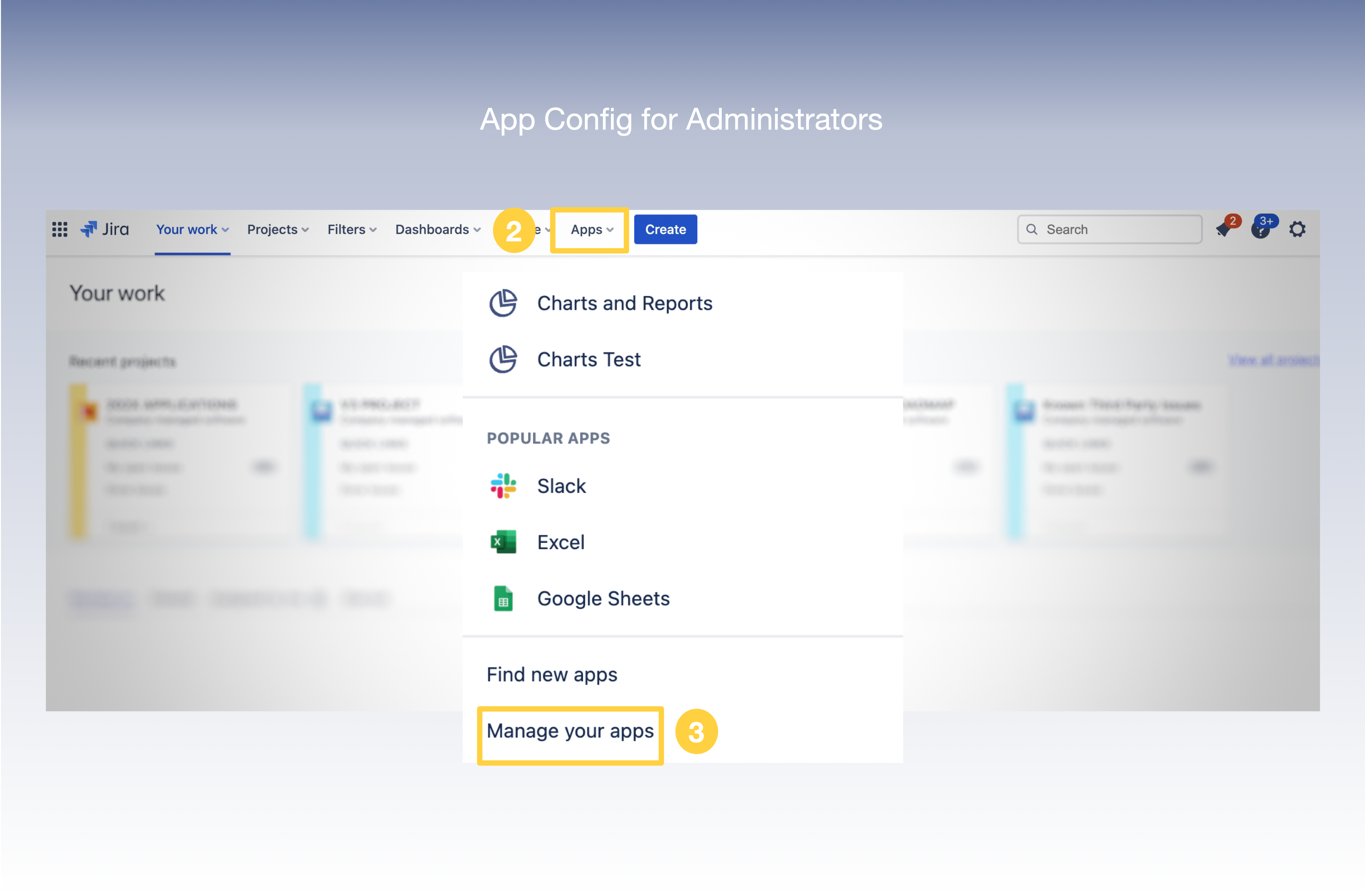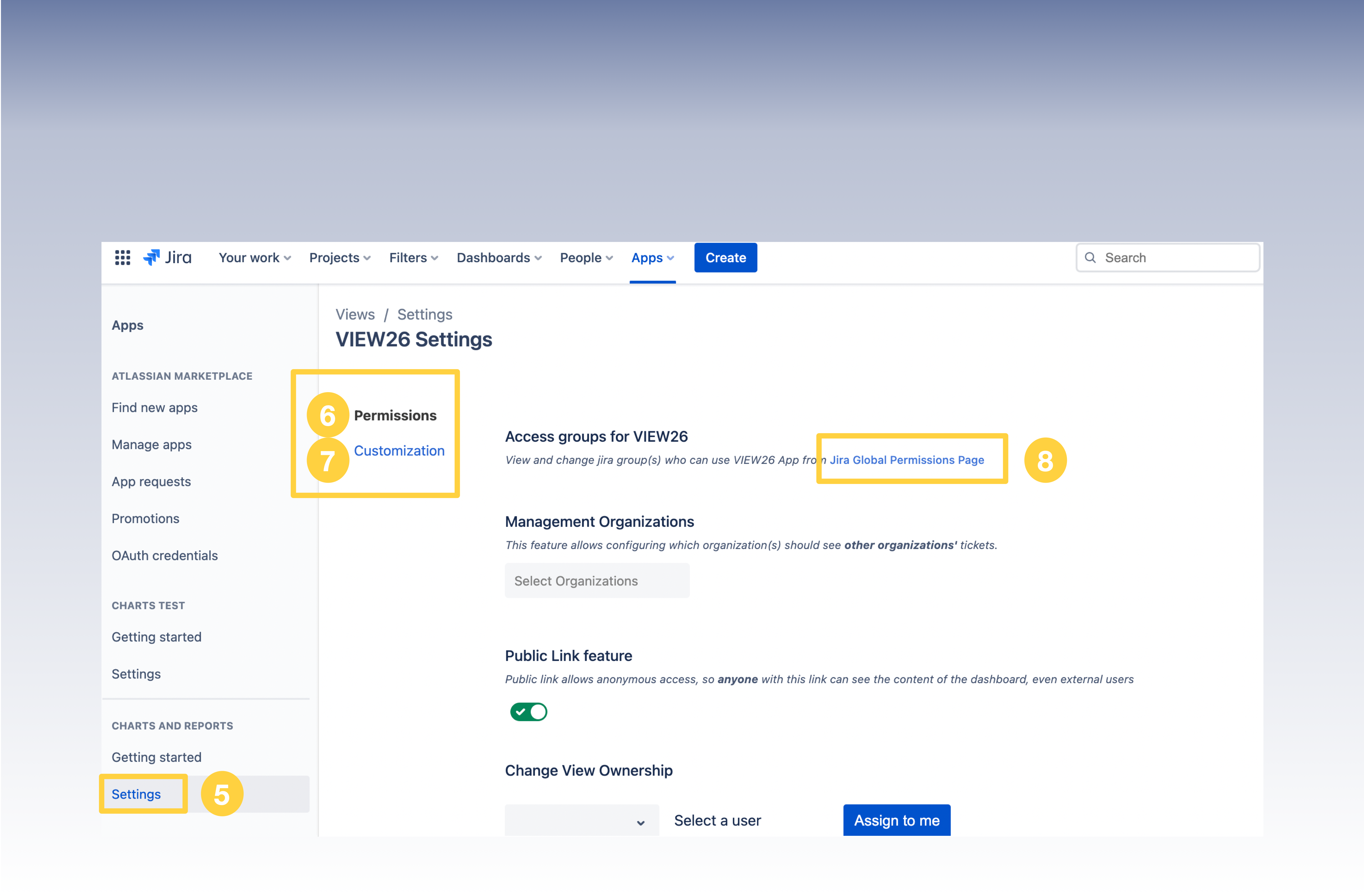 b) Project Settings (Select the Jira projects and custom fields to include in the app; unselected items won't be available)