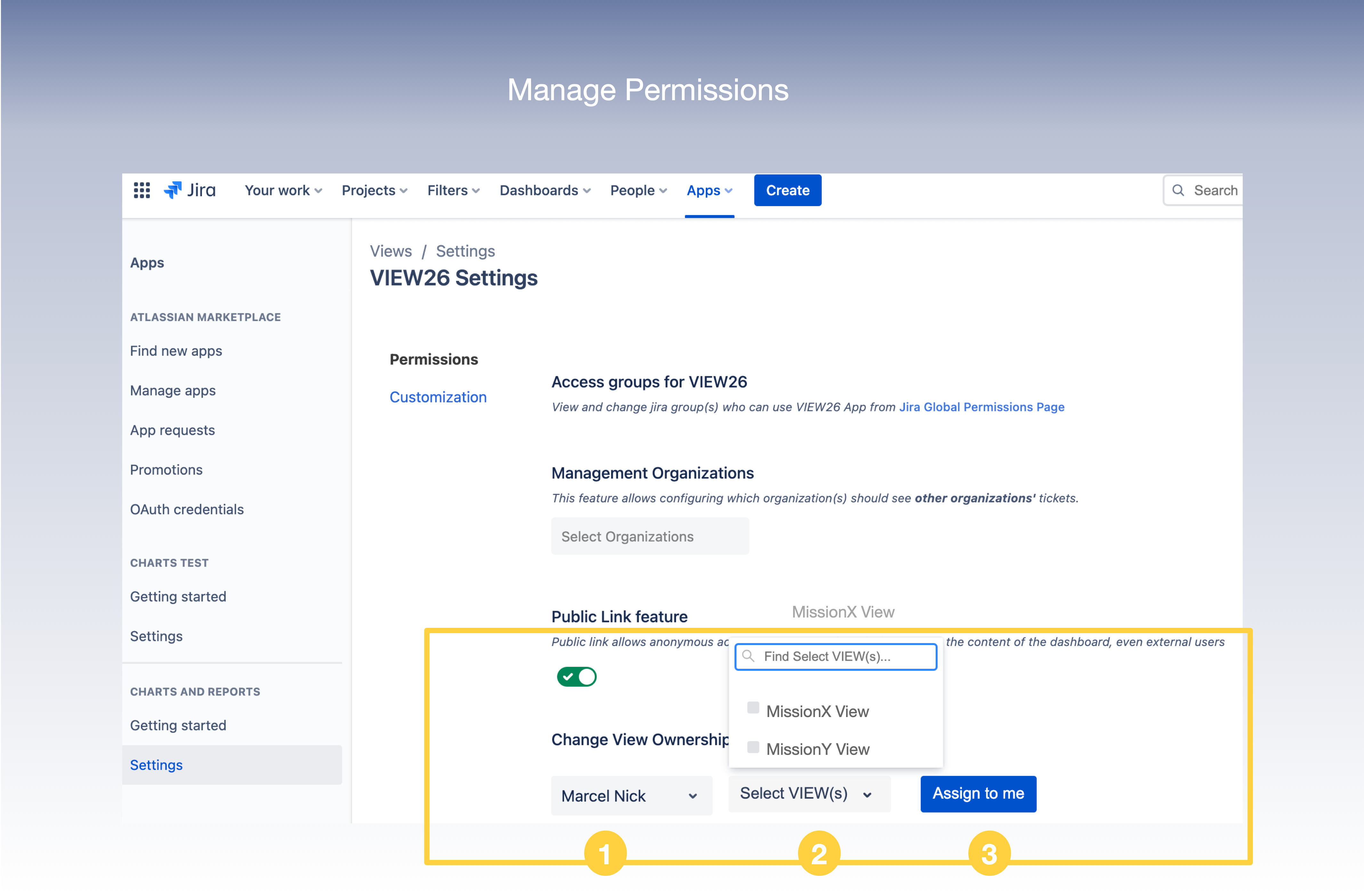 We allow admins to change the ownership of VIEW(s) created by other users. To change the VIEW ownership, head to the App settings → Permissions → Change View Ownership